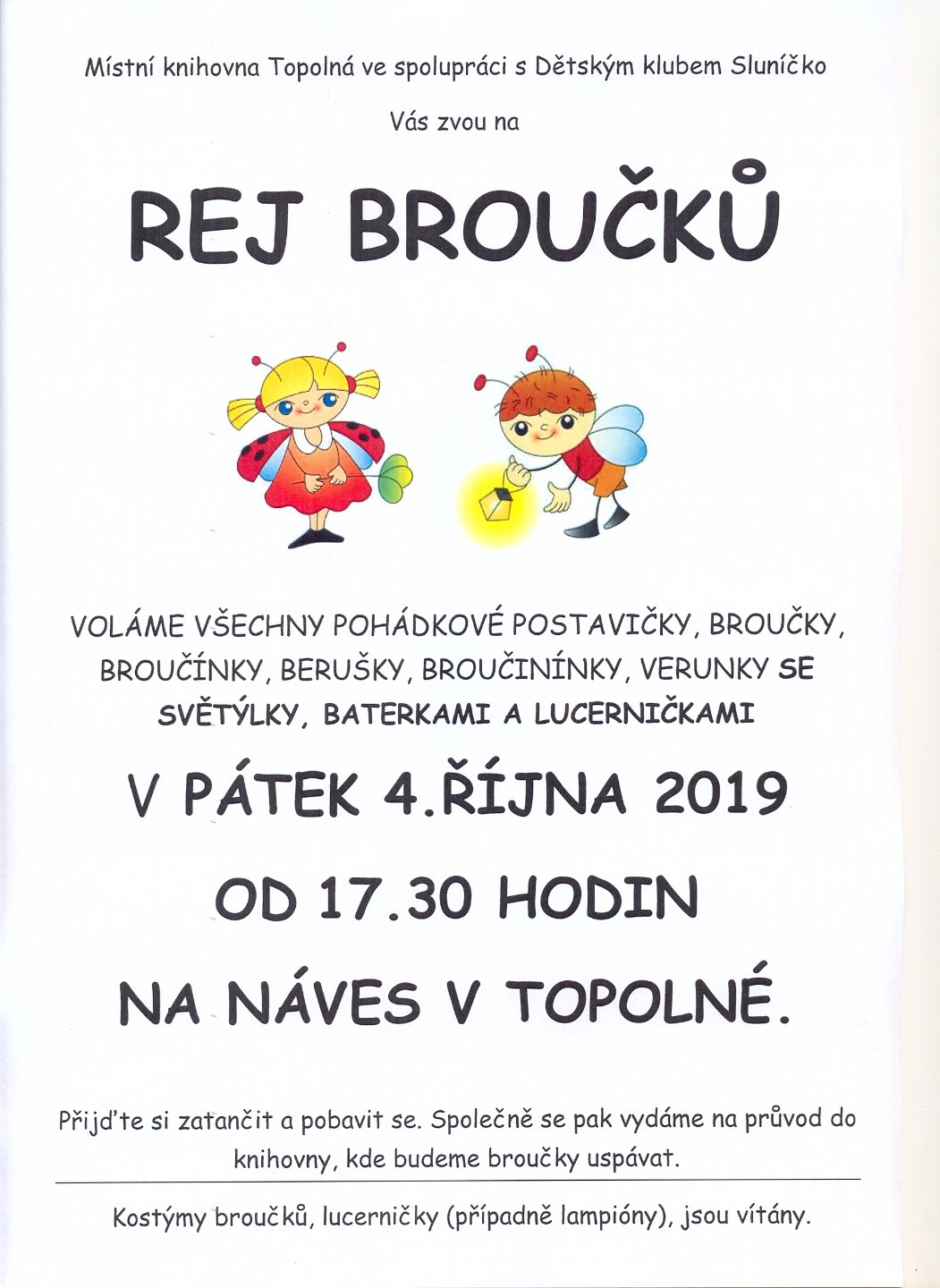 Lucerničky,lampionky a kostýmy broučků a berušek a hlavně dobrá nálada patří k akci nazvaná REJ BROUČKŮ. Zábavné odpoledne pro děti zajistily maminky z klubu Sluníčko. Poté následoval průvod do knihovny, kde byla tato akce ukončena předčítáním z knihy NA DOBROU NOC.