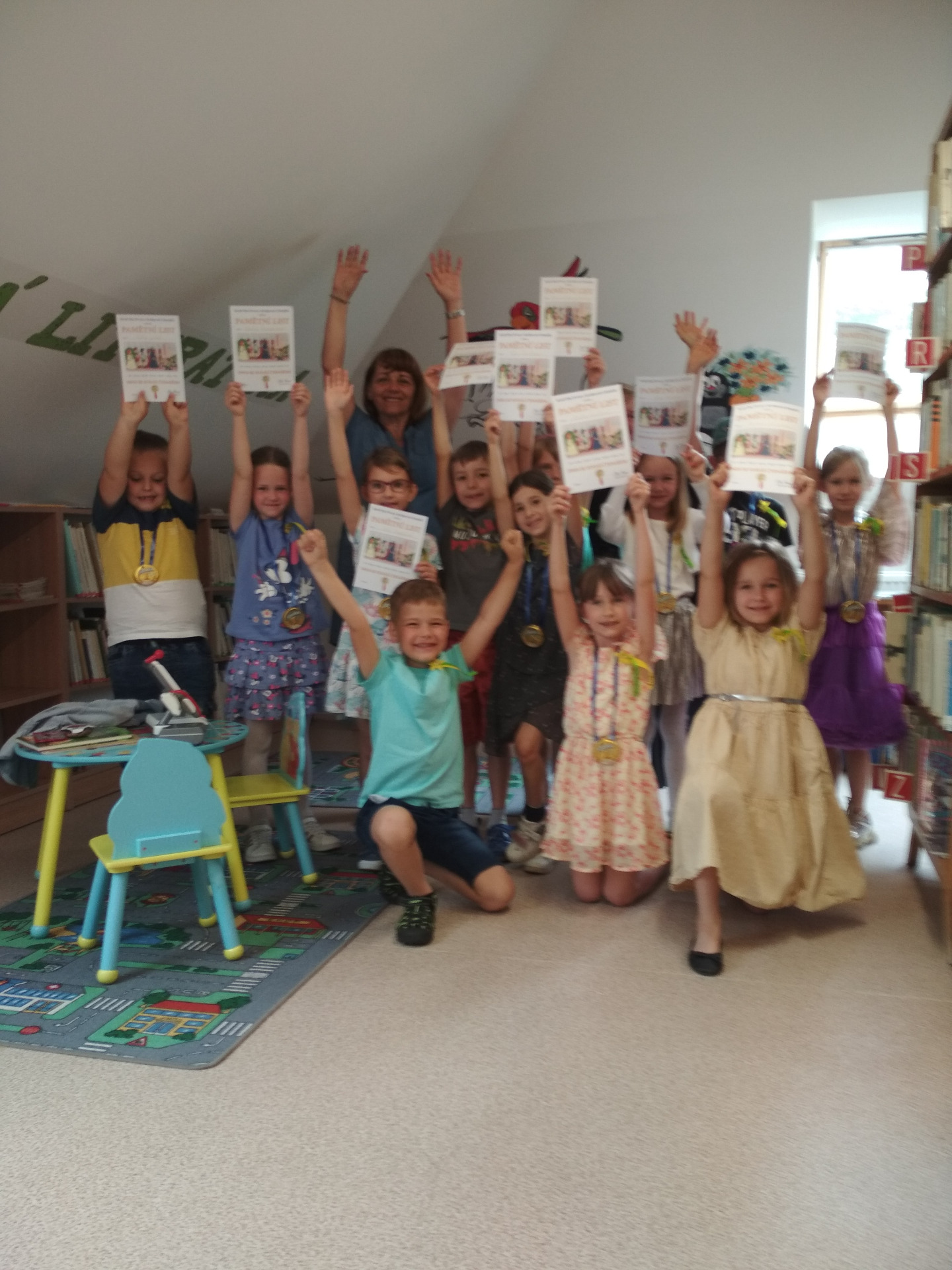 I letos proběhlo pasování prvňáčků na čtenáře velmi slavnostně. Děti se snažily a byly moc šikovné. Za své čtenářské dovednosti byly odměněny knihou na prázdniny z rukou pana starosty, medajlí od paní učitelky a diplom předala paní ředitelka. Od nás z knihovny si děti odnesly malou šerpu jako vzpomínku na tento den. A co bylo těch sladkostí!